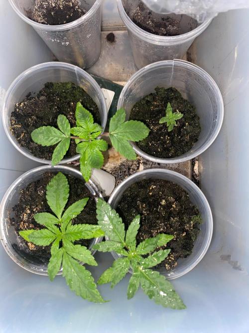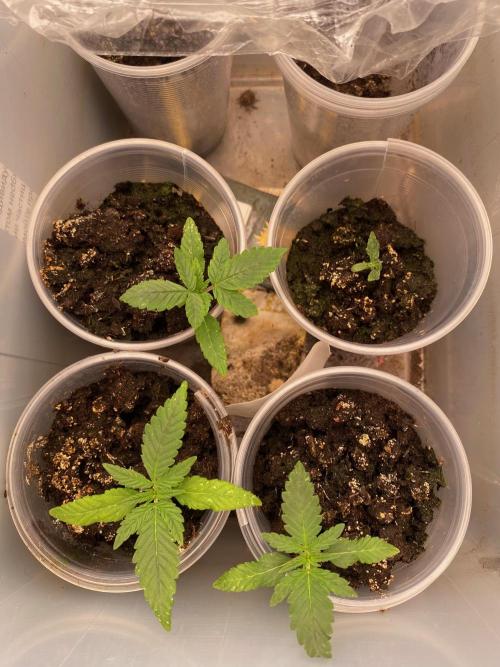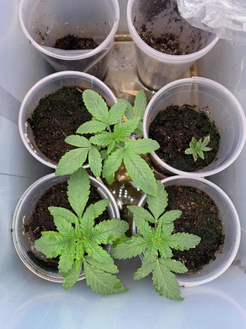 Четыре ростка дотянулись до верхнего края стаканов. Два Wedding Cake изначально были сильнее и крупнее, но один Sour Diesel их догнал. Второй растет медленнее, но развивается.
