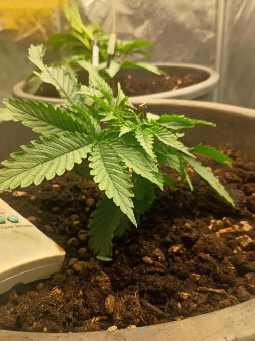 tigerbomb come si vede c'è qualche insetto che ha attaccato la pianta, ho messo una trappola di foglio appiccicoso e vediamo come va, vorrei aumentare un po l'umidità, oggi 8 ho abbassato la lampada a 35cm, la quarta settimana inizia il 12