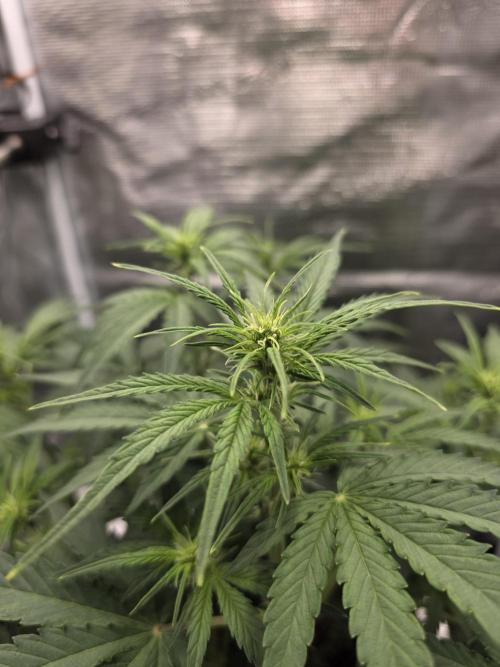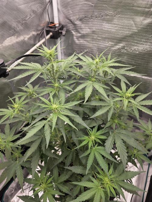 Kushcoma 10/10/25: Went away for a few days. She’s grown a lot. She’s showing pistils now, so she’s in her pre flowering stage. Increased PPFD from 320 to 360. RH from 65 to 60%