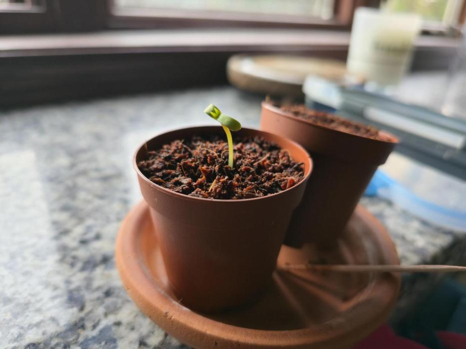 CalicoCatMom Planted directly into coco coir on 10/3/25 in windowsill container. Sprouted on 10/6/25 - moving to basement greenhouse. Starting build a soil in 7.5 gal fabric pot to get the living soil ready. There is currently two strains in the grow tent drying. Will move the seedling into the grow tent once the other strains are dray and ready to move out.