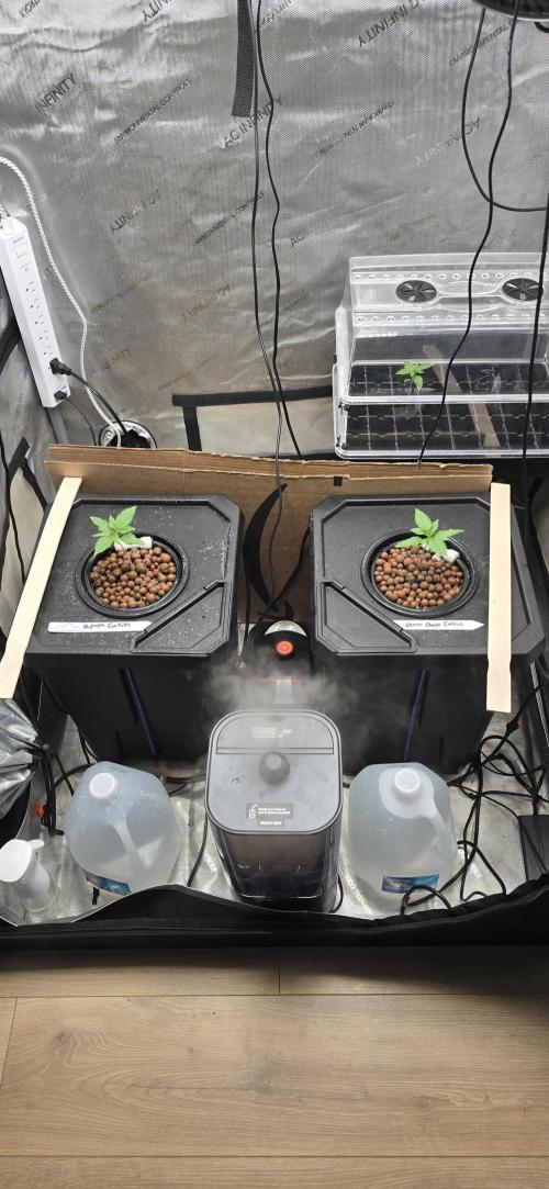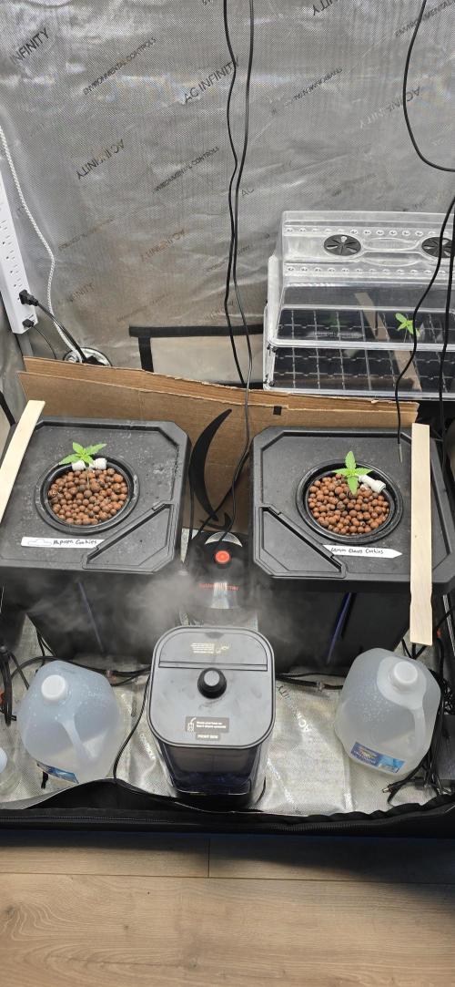 Prilyfe13 10/01/2025 Week 1 of Veg. Let's talk time frame for a minute. Both of these plants are 8 week autoflowers. Seed to harvest. They should be ready for harvest in late November early December. We shall see. I've heard mixed opinions on how long or short a time it will take in DWC. Some say it's a week or two faster and some say they get bigger but take a week or so longer. Both say they'll get bigger in DWC. So that's the goal. Bigger is better. So in other words, timeframe is just the expectation. But it all depends on the environment and the strain and the plant and all that. Everyone is different. Well, for Lemon Cherry Cookies, she's in the very early stages of Veg. Papaya Cookies on the other hand is not doing so well. No idea why she has a near white stem and her tips are still yellowing and it's spreading. I dropped the light intensity down to 197 PPFD for now, had to pH the water again for both plants. It was really high. Like 6.8 high. My water is horrible. After the filter, it's still 8.5 I didn't check without the filter as I won't use the regular tap water. But with the pH being so high already, I think I'm gonna use distilled water. Too bad. I bought the Pur filter thing just for the plants. I won't drink that water at all. No thank you. Anyway, so as I said, the pH was high. That could be the issue. Now it's down to 5.85 right where I want it. The TDS and EC are also in range. So if that was the issue, we should see some improvement throughout the day. However lights out is at 11:33 am and turns back on at 5:33 pm. Kinda stupid if you ask me. Lights out in the middle of the day? Why AI? Why? So Lemon Cherry Cookies as said is doing great! Her first set of true leaves are coming through nicely. Great color green and her stem is even starting to turn a nice shade of purple. I'm pretty sure that's a good thing. Technically she's still a seedling, but I didn't want to ruin my starting week. Day 1 of Veg is day 1 of the month. Just works for me. She seems to be really adaptive to her environment or just really resilient. pH was also too high, TDS and EC are spot on and now is pHed to 5.85. not much else to say for today. I had to raise the light and turn the intensity down to 3. Now the DLI is at 15.8. perfect range for seedlings. A little on the high end of the range, but as I said, Lemon Cherry Cookies is taking it all in. No issues at all. Let's hope Papaya Cookies bounced back. Or I'll be one sad baby plant owner. Temp: 66° lights out 74° lights on RH: 74% VPD: 0.54 kPa 10/02/2025 Just a quick one today. So I bought the AC Infinity heater for the system. It works fine, but the humidifier I have is either too much or not enough. So far I have t found a middle ground. I'm trying to get the temp to stay at 75° and the humidity between 70% and 80%. 75% would be preferable as these are still seedlings and still need the moisture. Both plants have a bit of yellowing on the tips. Not sure what it's from yet. Hopefully I'll figure it out very soon. It could be the pH being super high for a bit. That's what seemed to gave caused the issue. But I'm not sure. Anyway, I noticed something interesting about the other Papaya Cookies. You know, the one that shouldn't have made it. It has the exact same droopy leaves as this one. AND, the other Lemon Cherry Cookies is reaching just like this one. That's some good genetics I think. Knowing the drooping vs the reaching, I feel like the drooping is natural to this strain. Or both plants are suffering the same issue. But they are now in totally different environments. Makes sense, right? Or am I crazy? Temp: 76.1° RH: 65.2% VPD: 1.06 kPa 10/03/2025 And for the win we have Papaya Cookies with a massive comeback today. She was leaning really hard. But then she perked up when I got everything to the right temp and humidity. Had to buy a heater to do it, but yah. The next thing is the humidifier I have. It's great for bedrooms. Definitely not for growing tents. No auto shut off. Only 3 settings. The one I got today will be here tomorrow is the AC Infinity humidifier. So it will integrate with the controller and we'll see some real precision. The tent is sitting at 74.7° and the humidity bouncing around between 65% and 82%. Not great, but it'll work for the next 24 hours. At least they're still seedlings and need the humidity. Lemon Cherry Cookies looks amazing. Her first true set of leaves are coming out nicely. Soon enough she'll start to grow vigorously. Both will. But I have a feeling this one will be the bigger of the two. So now I have the heater, humidifier, AI controller, side lights, I just need the 6" fan and filter. Maybe. And the bar lights. I'm not gonna get the ones for the 3x3. I'll get the 4x4 ones. Those are 2.5 ft x 2.5 ft. Perfect for my 3x3 tent. Talk about wall to wall coverage. So issues I'm having. My pH keeps climbing up. No matter what I do. pH up, more and more and more. I might have it stable by now. I'll have to check in the morning. The temp of my water is way too high at 75° it's from the heater. It blows directly toward the buckets. I have a piece of cardboard with a spacer to help keep the heat off them, but that's as far down as I could get it. Maybe with the heat where it is and the humidity the water will end up being that warm anyway. It should cool off when I switch to veg in the tent. I'll keep it at 72 so the heater doesn't really have to be on much. It should also cool off the water. Anyway, numbers for the day. Temp: 74.4° RH: 77.8% VPD: 0.65 kPa 10/04/2025 We have some super healthy and happy ladies today. I added in another half teaspoon of Lotus Grow and a half teaspoon of cal/mag. It's not much, but these little ladies are transitioning to the veg stage and I don't want to burn them or stunt them. Speaking of stunting. I was worried about Papaya Cookies a bit, but she suddenly bounced back. Now she has her first node just like Lemon Cherry Cookies. I think I got the pH to level out finally. W