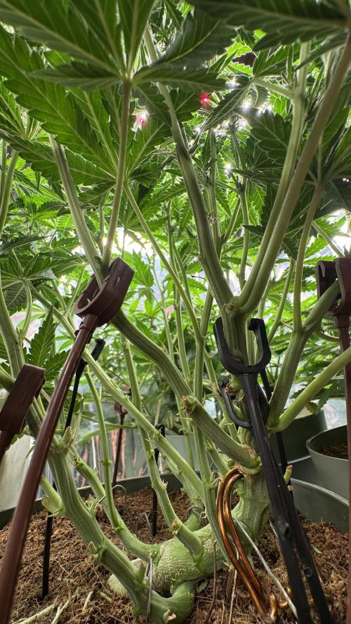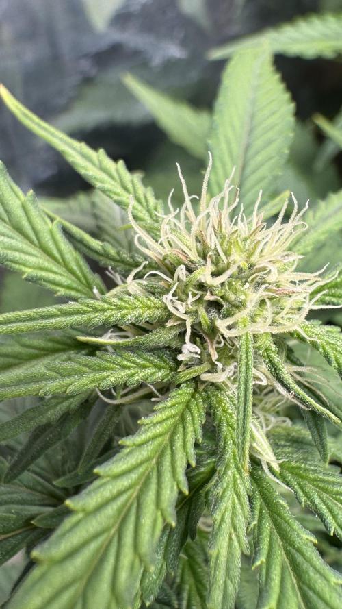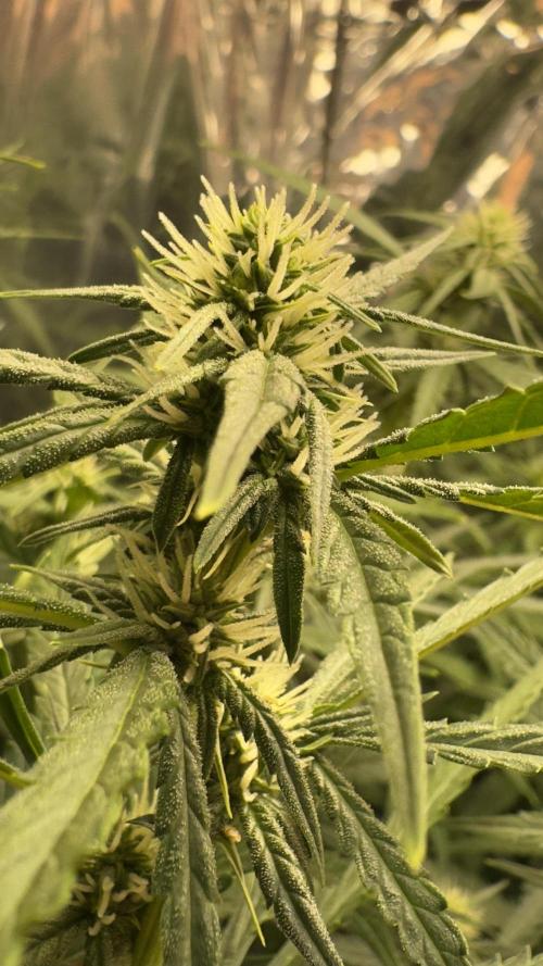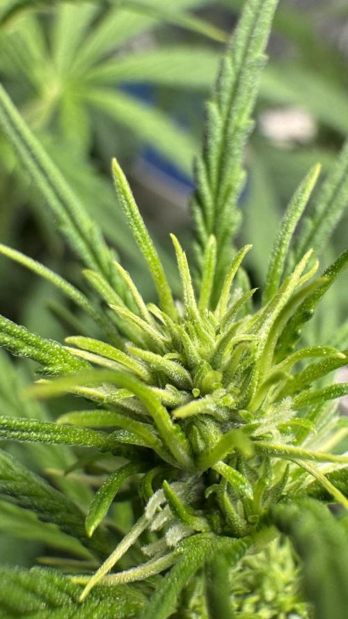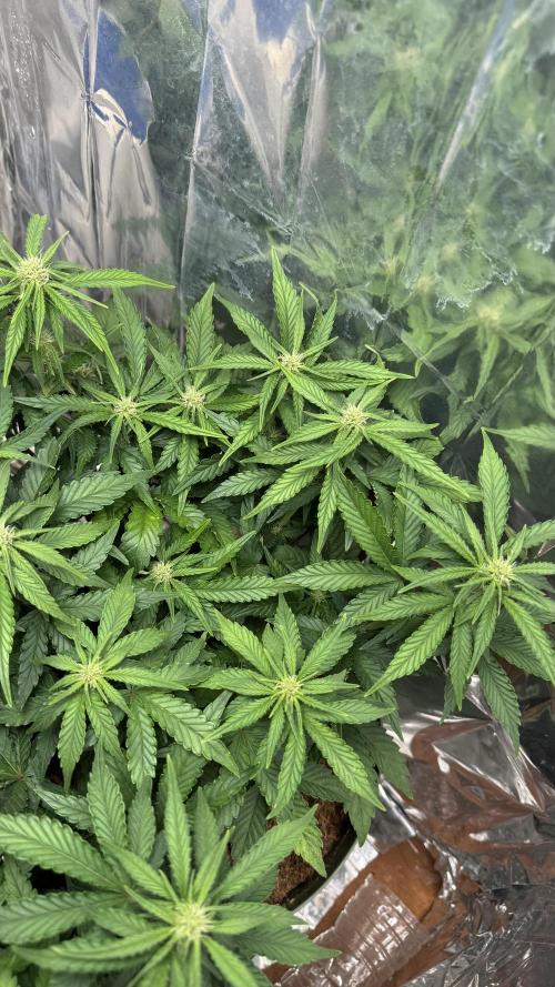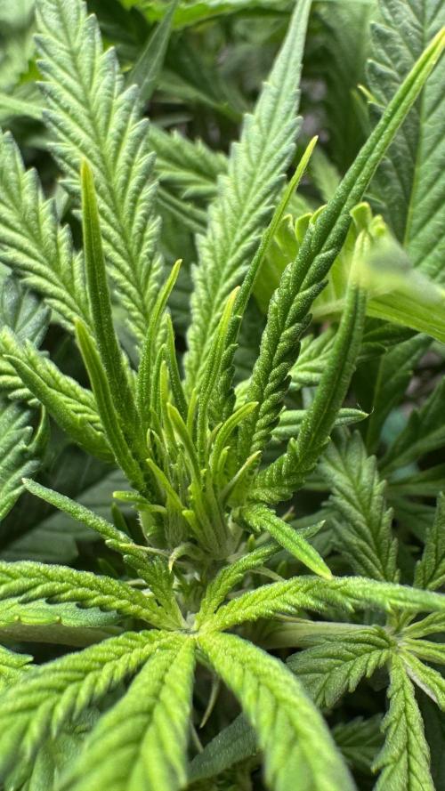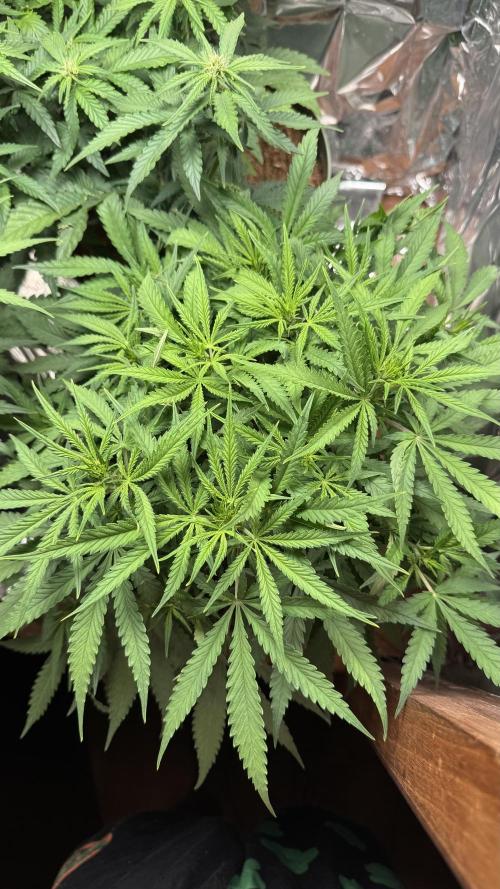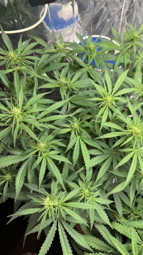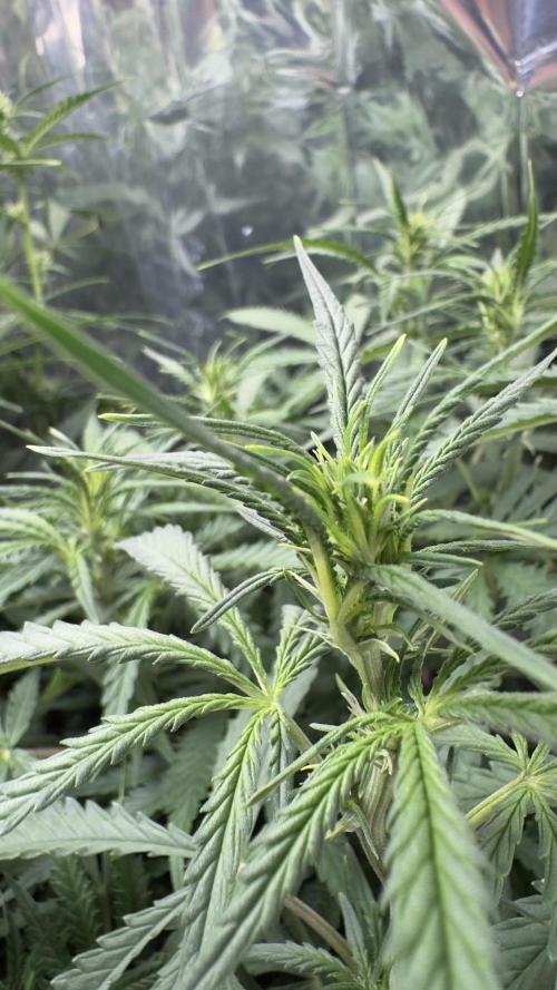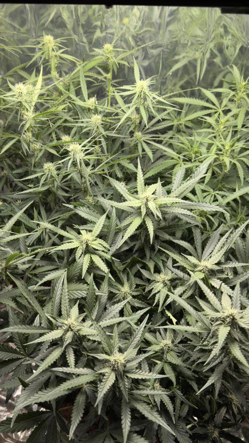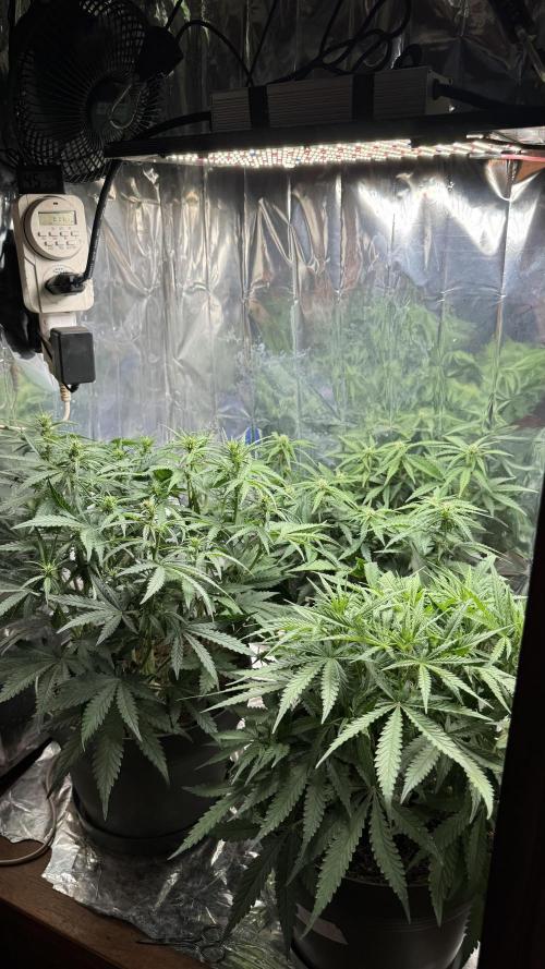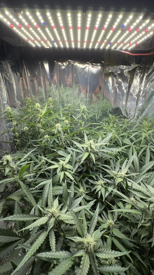 CaduCCCP Registros do dia 1º de outubro de 2025. A Floração da Northen Lights da direita aparentemente ainda não começou. Já a Northen Lights da esquerda e a Gorilla deram um boost de crescimento, já na fase de stretching. Reduzi o Nitrato de Cálcio para 0,6g/L e subi o MKP para 0,75g/L, mantendo Plant Prod em 1,15g/L e o Sulfato de Magnésio em 0,5g/L, que seguirão nas mesmas medidas do início ao fim do cultivo. Começo a reduzir um pouco a umidade do ar. Subi um pouco a Quantum Board para manter a distância e não gerar estresse de luz, a aproximadamente 35cm dos top buds. As plantas aparentam estar felizes com a intensidade de luz, considerando a posição das folhas novas apontando pra cima, fenômeno conhecido como “praying leaves”, que traduz que estão recebendo a quantidade ideal de luz sem sintomas de estresse ou excesso. PPFD mantido aproximadamente em 1000 umol/m⅔s. Aparentemente, o crescimento da população das cigarrinhas foi contido, e não se tornou um problema. Mantenho o protocolo de primeiro tirar uma foto do grow completo, seguido de três registros de cada uma das plantas, sendo uma foto de cima, uma com zoom de um top bud e uma debaixo, sempre nesta ordem: Northen Lights da direita - Northen Lights da esquerda e Gorilla.