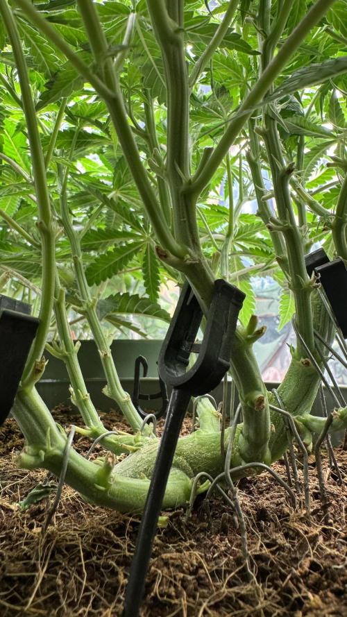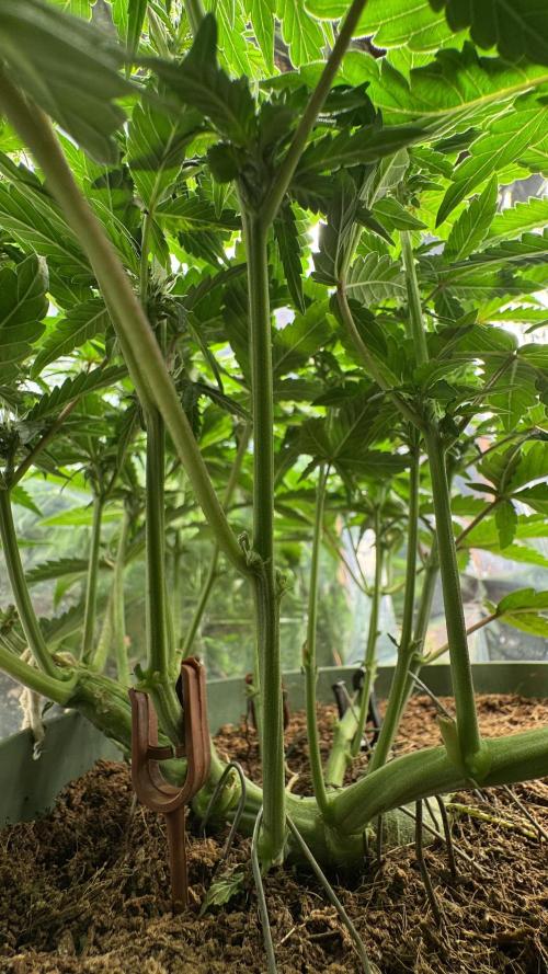 CaduCCCP Registros dos dias 8 e 10 de setembro de 2025. Mantenho o LST bem rente ao solo, considerando a limitação da altura do meu grow. Começo a aplicar defoliação nas Northen Lights, para liberar luz para as folhas inferiores. A deficiência de nitrogênio que eu havia notado nelas foi resolvido, já que as novas folhas pararam de crescer amareladas.