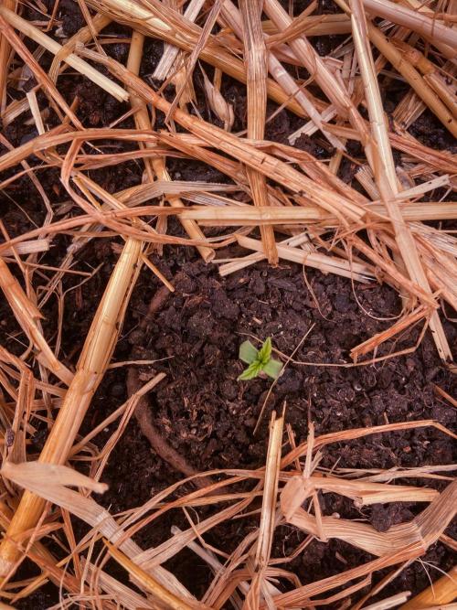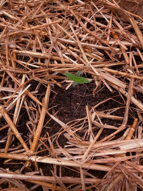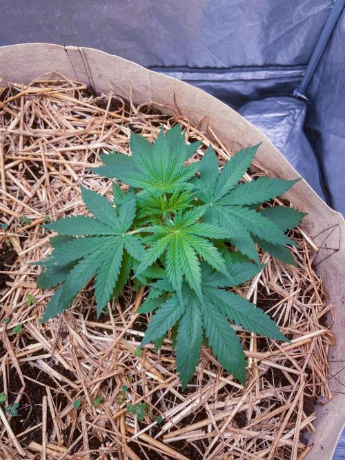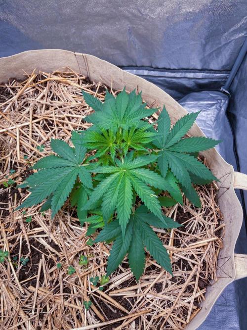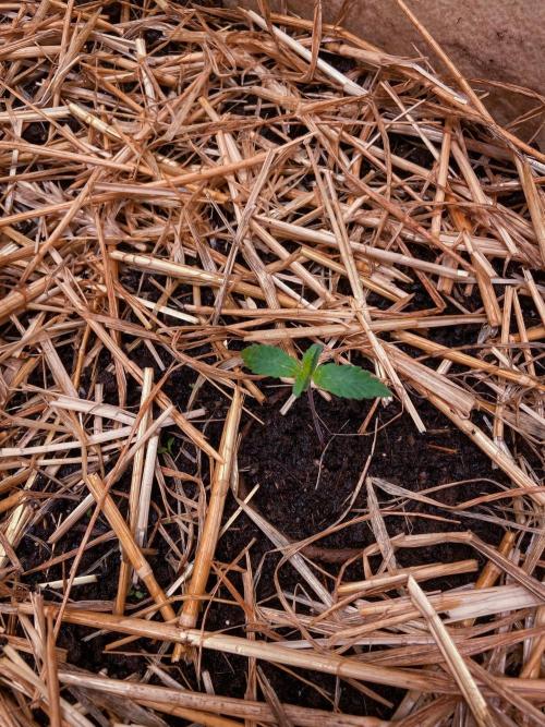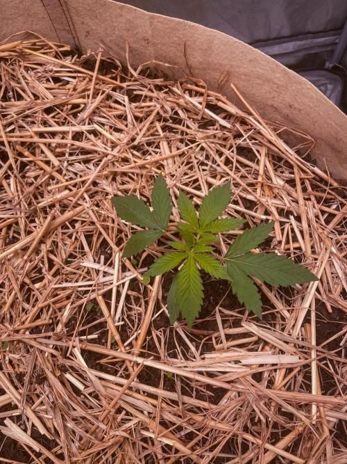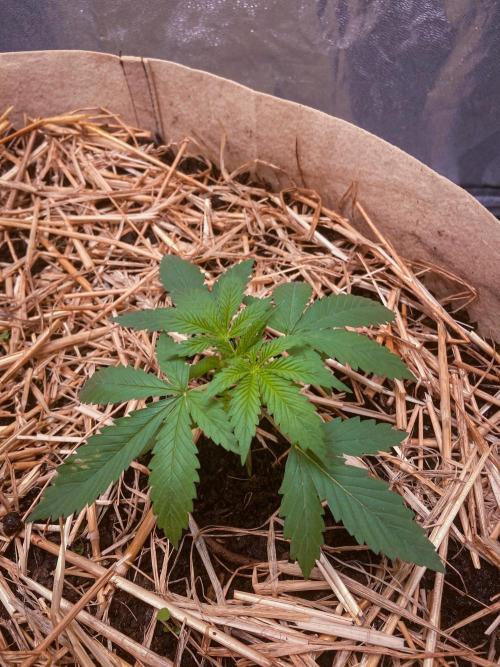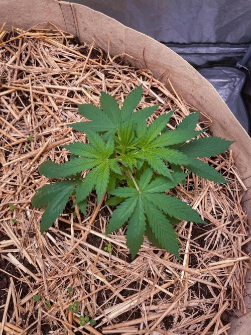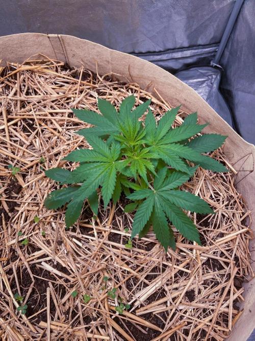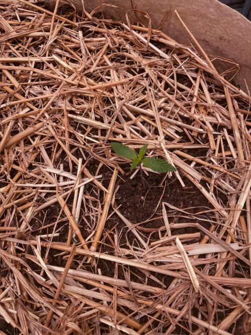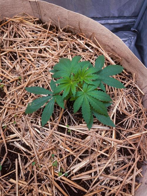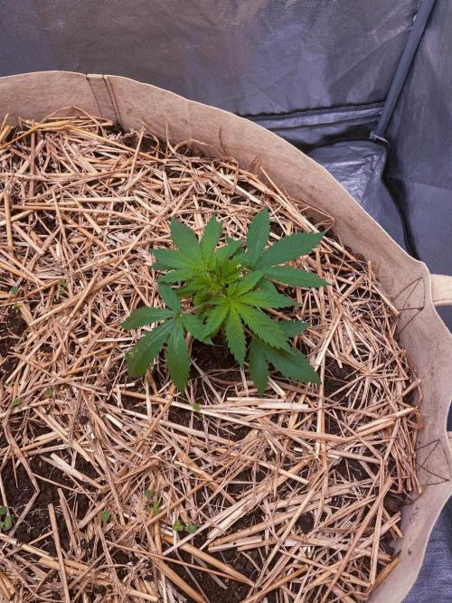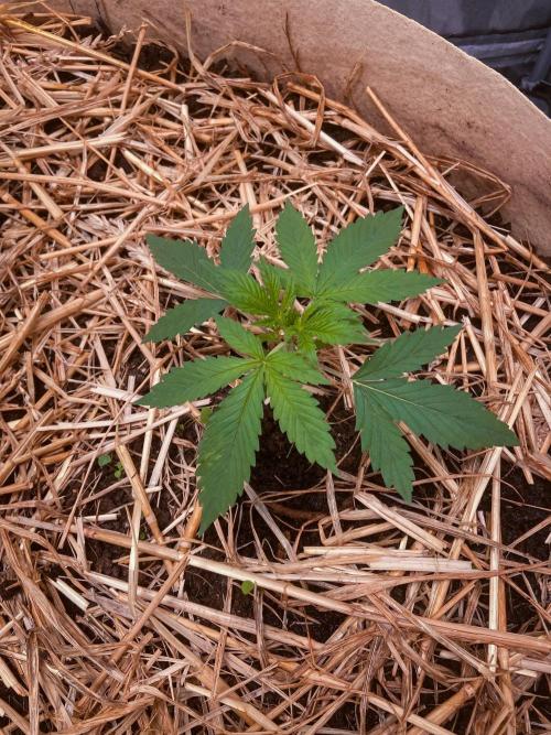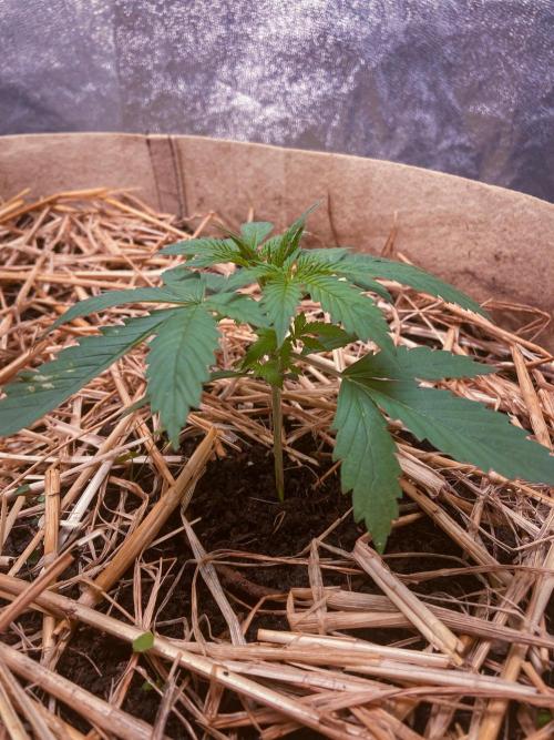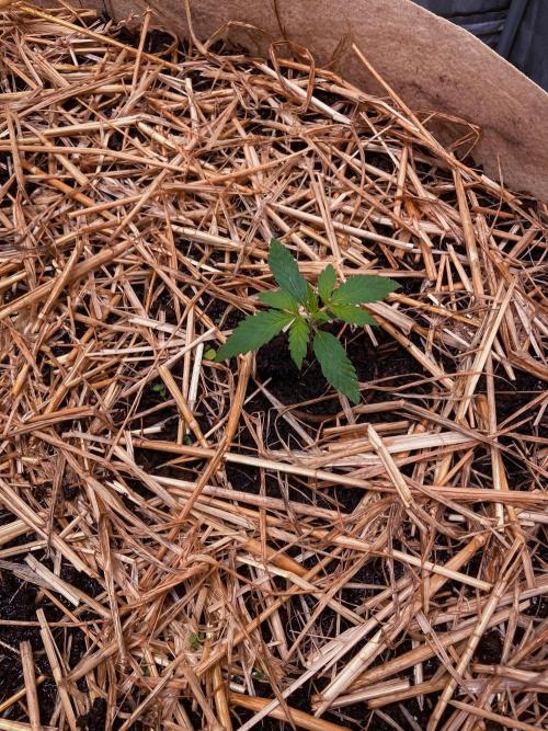 Bubblegum ๐ธ started her journey in the big 113 L living soil pot. At first she looked tiny and fragile above the mulch ๐, but underground her roots were already exploring ๐ธ๏ธ a soil rich in humus, biochar, and minerals. Only declorinated water ๐ง was given, just enough to support her first steps without stress.