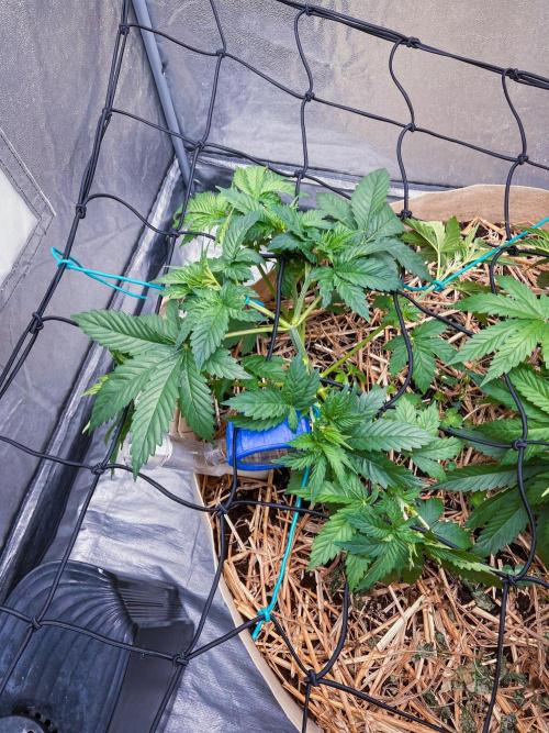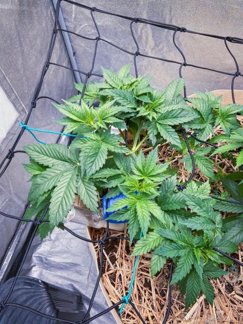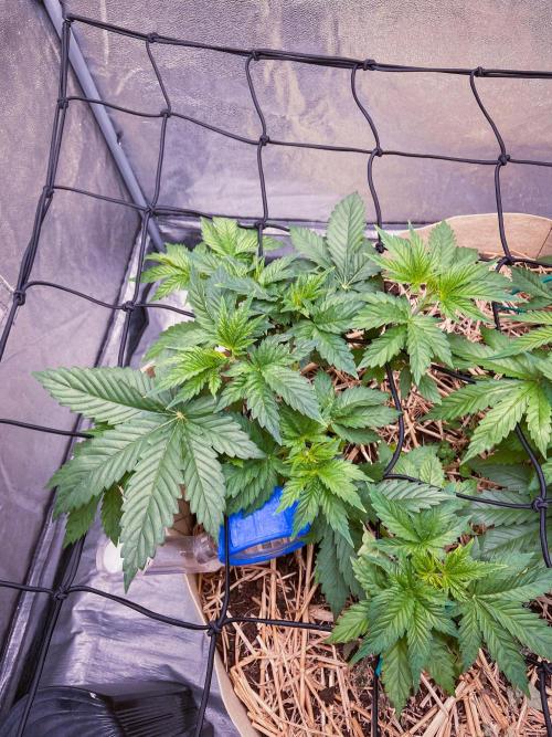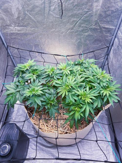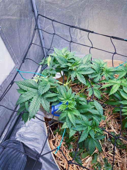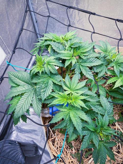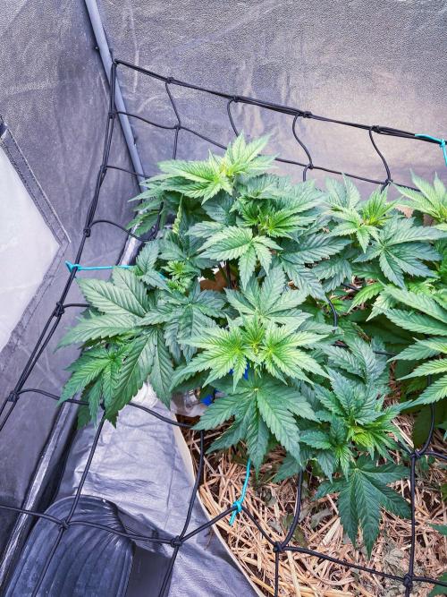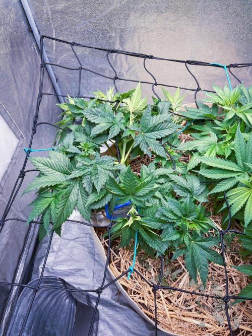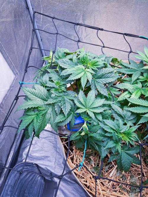 After the topping, she’s begun spreading out nicely helped by the LST and SCROG training, opening up her structure for even light and airflow