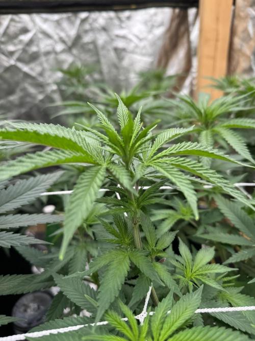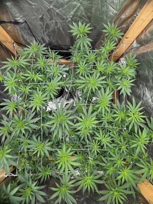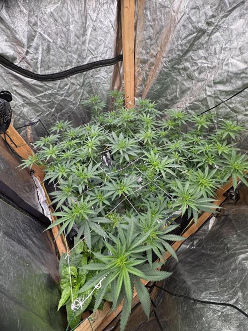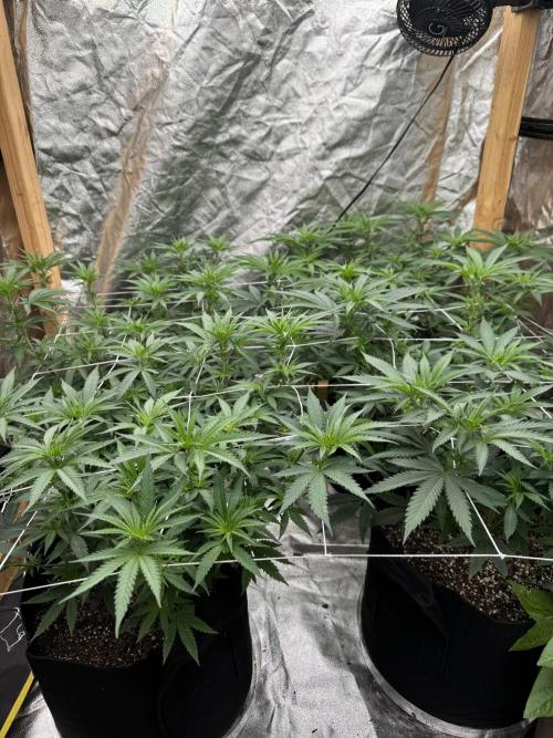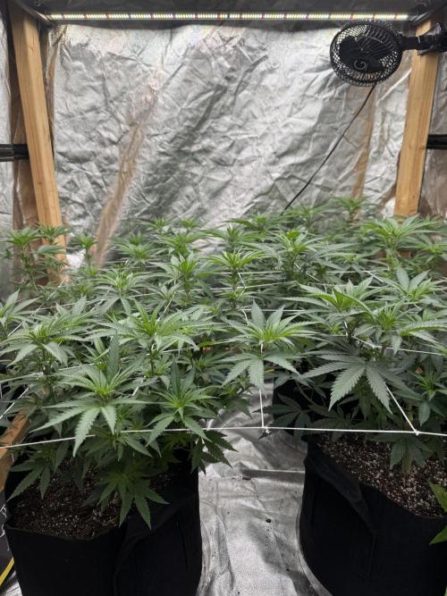 Trichometemple206 Week 6 of veg and the Super Boof plants are really starting to take off I’ve just been letting them grow vertically to build some height before I drop in the SCROG net. Haven’t had much trouble at all this run, they’ve been cruising along and looking super healthy. The structure is right where I want it, just waiting to spread them out for an even canopy before the flip. Excited to see how they fill out from here.