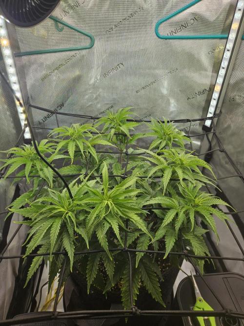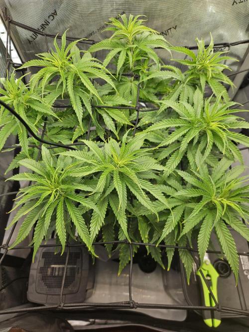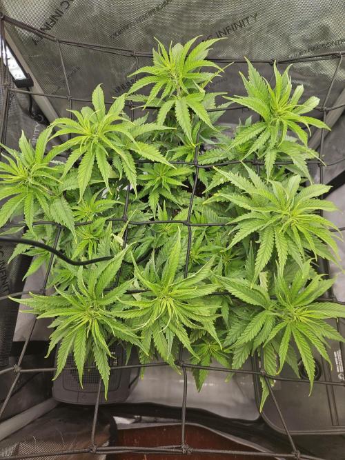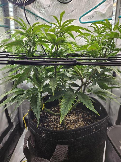 BobbersDown Charging forward full speed. Trellis went on after pics. At about 75% feeding, 3 quarts of water every 2 to 3 days. Feed every other watering. Smells strong for a vegging plant.