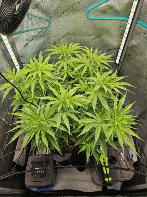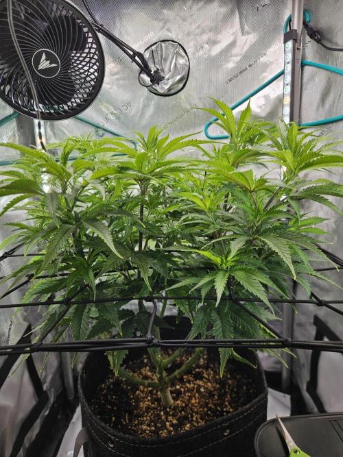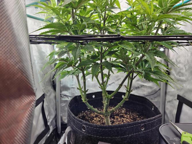 BobbersDown Charging forward full speed. Trellis went on after pics. At about 75% feeding, 3 quarts of water every 2 to 3 days. Feed every other watering. Smells strong for a vegging plant.