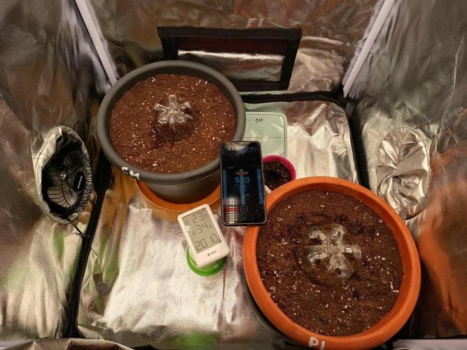 FirstFarmer420 První týden vegetace je před námi. Holky rychle vykoukly nad povrch substrátu. Světlo je na 75 %. Ve výšce cca 51cm od vrcholku rostlin.