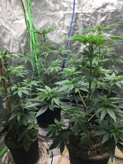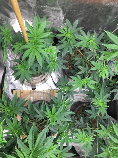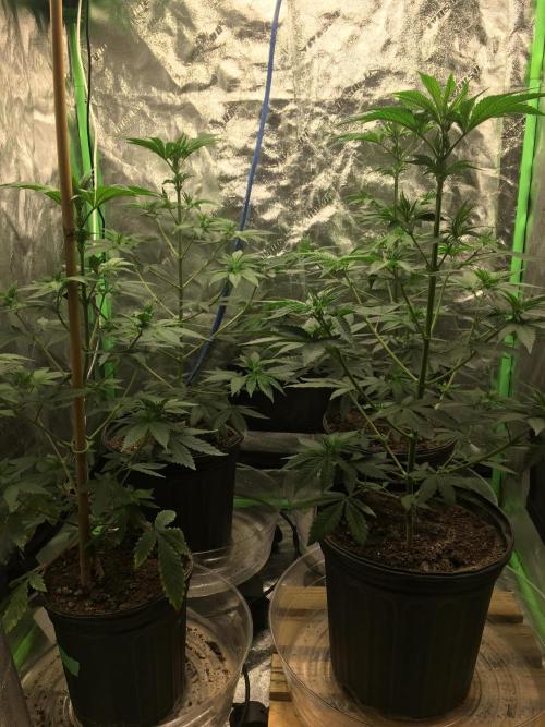 These ladies were started with my other grow (Ricky's Hash Plant + White Wedding RBX) but they finally got booted out. I was planning on letting them veg for one more week in the other tent but, fuck it, they're not going to get much larger since I am not transplanting them. Cramming four plants in under three square feet is tight, this is my "sea of green" attempt. I am currently growing some of these plants outdoors and they had a decent stretch to them when they flipped to flower. Hoping this little tent will be packed. That being said, I have my reservations about the strength of this light. I am testing how it works with this run. Ultimately, this tent (and light) were purchased with mother/veg in mind so this will probably be the only time this light does flower (except maybe a sex test run).