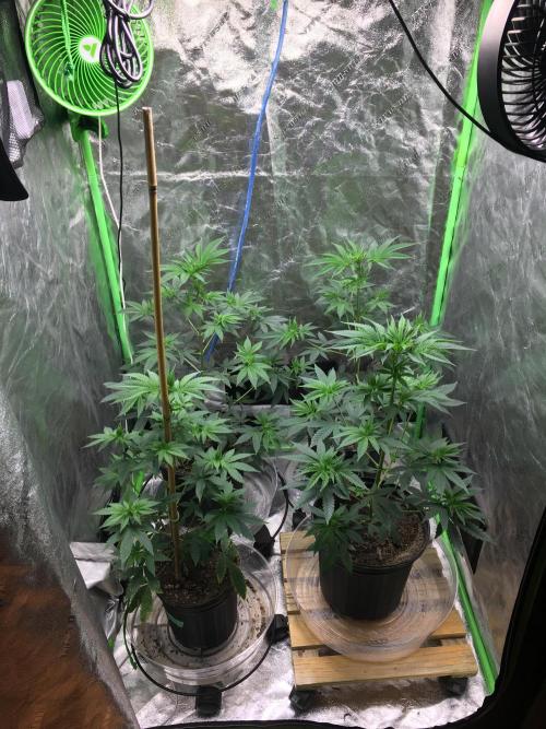 Stretch is going well, should go on for another week or so before we see buds. Gals got fed yesterday (liquid, power bloom, + worms). Still pretty wet from the nematode treatment. They also did not like my cold basement floor (winter is coming) so I put them onto pot stands. They seem to be happy. I also switched flowering to day time since I was dealing with light bleed in the tent. Might do a light defoliation this week but I am going pretty low maintenance on these ladies.