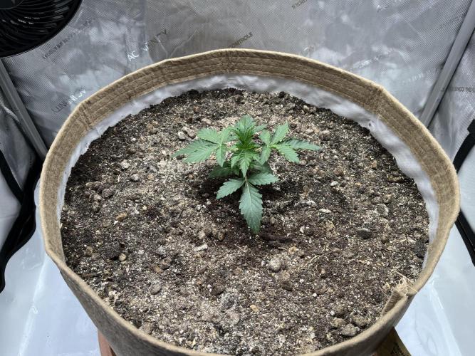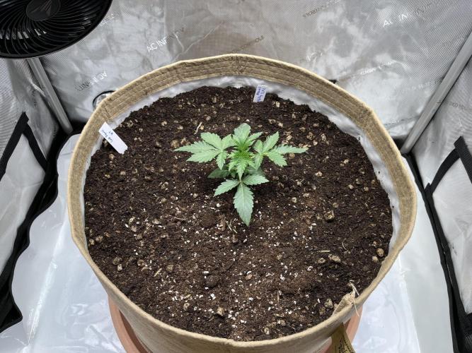 Last Dance was the first who broke through the surface. She looks definitely like a more indica leaning hybrid with this typical leaf structure. Also she doesn’t like the light intensity like the other two plants in the seedling tent. Curled her leaves which can be a sign of too excessive light intensity. Pulled the pot a little bit more away from the light. Let’s see if something will change within the next few days.