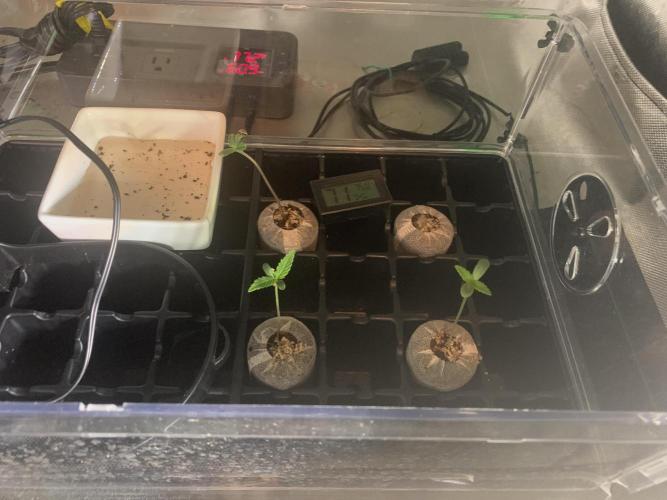 ed_bud : 9/28/25 - Soak (2) seeds in 0.5% hydro peroxide. 9/29/25 - Move seeds to damp paper towel in sandwich bag. Dark @ 74º F. 10/1/25 - Both seeds showing tap root. Placed into Coco Coin plugs in AC Infinity grow tray. 18 hrs daylight (@20% power), 78º F, 92% RH. 10/3/25 - Seedlings have emerged, increase light to 40%.