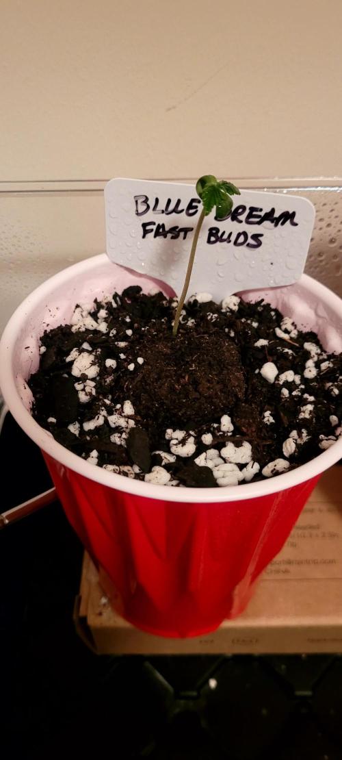 VirginiaGrower Blue Dream Auto by Fast Buds was started with the paper towel method, and after her tap root appeared, she made a new home in a Rapid Rooter, Fox Farm Happy Frog with perlite and Myco Bliss. She finally shed her shell to peep out on October 3rd. So far, she seems happy.😀 UPDATE 10/6 she's a little leggy. I've put her closer to the light, but she is one out of 4 with 3 different germination days, so trying to adjust lights, but not burn the younger ones.