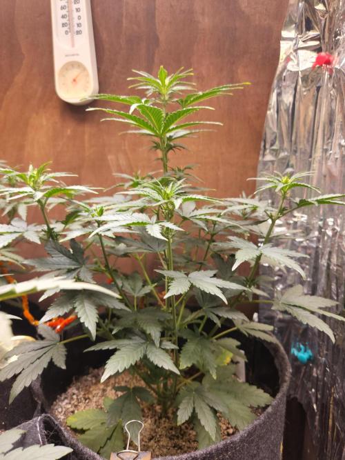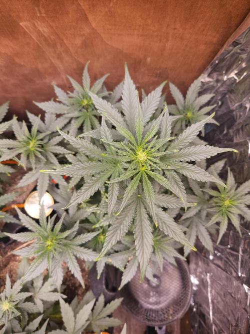 SouthWestHesh Very light defoliation of a very few very large fan leaves that were blocking light from reaching the lower canopy. This plant is a week younger than my other two autoflowers I am currently growing, but is is a much fuller plant. I made light use of LST, but mostly leaf tucking. This plant has 8 branches creating an even lower canopy with two more branches developing bringing the total to 10 satellites surrounding a main kola.