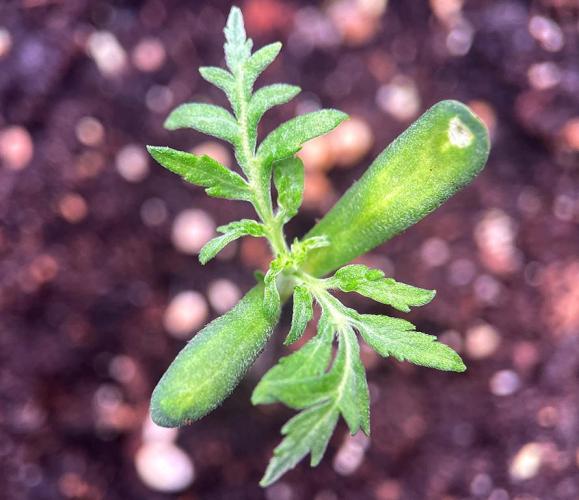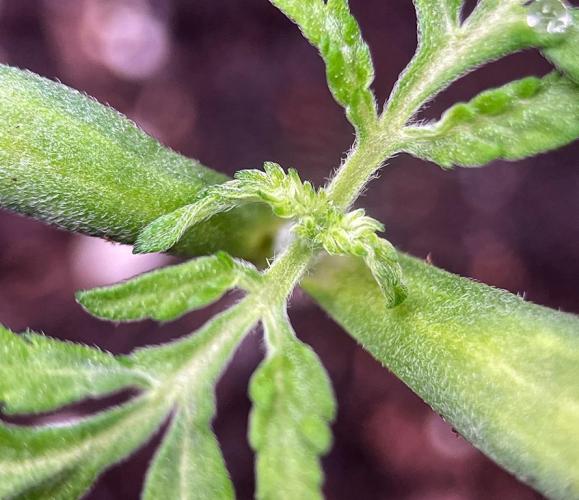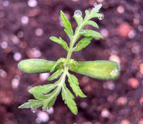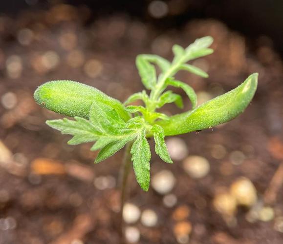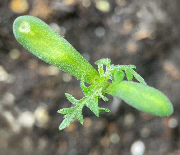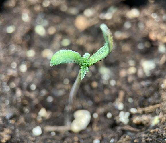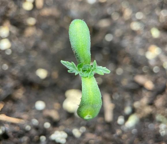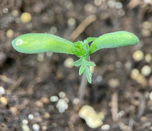 10 days old, cotyledons fully open, the first true leaves are visibly mutant in the formation, even at such a small size.