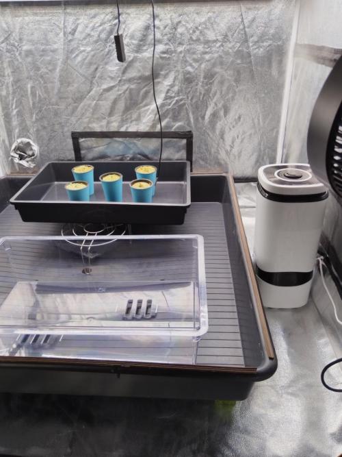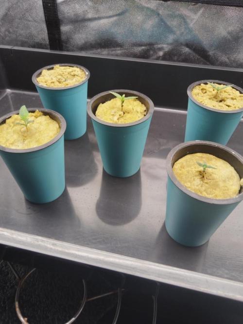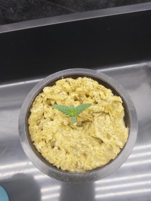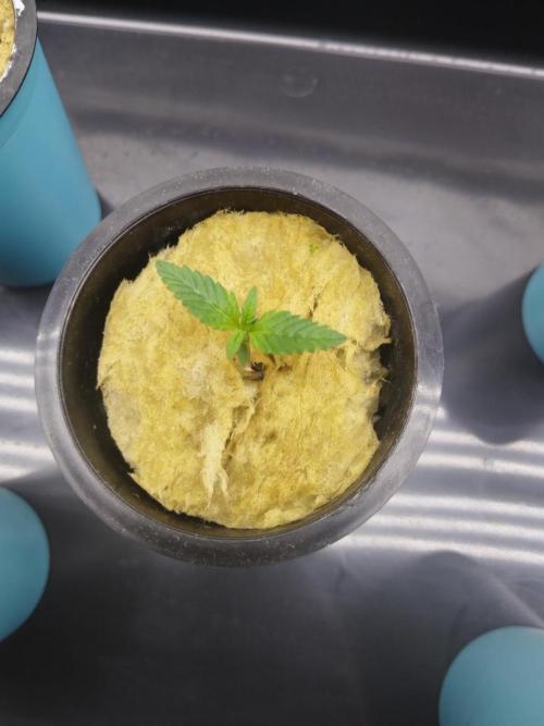 Day 5. Seeds start sprouting (3) from rockwool. Light distance 60cm - 150ppfd