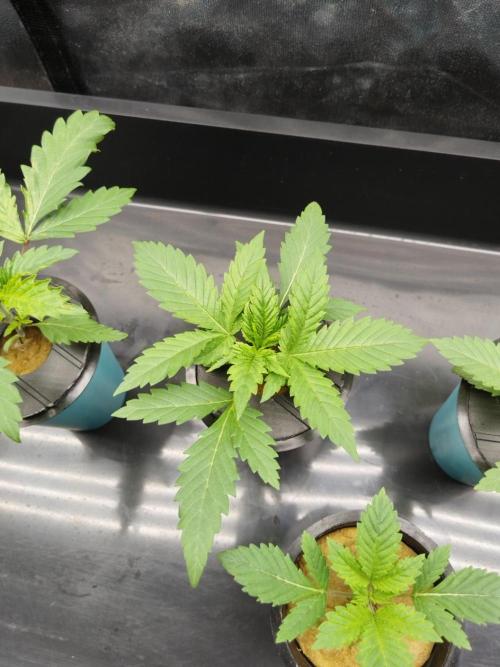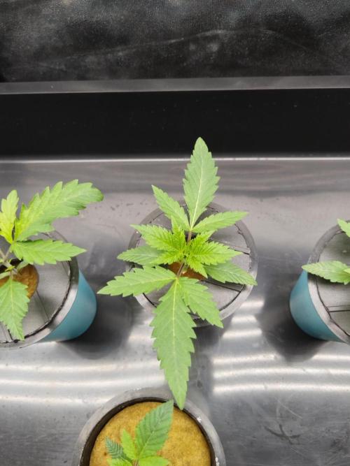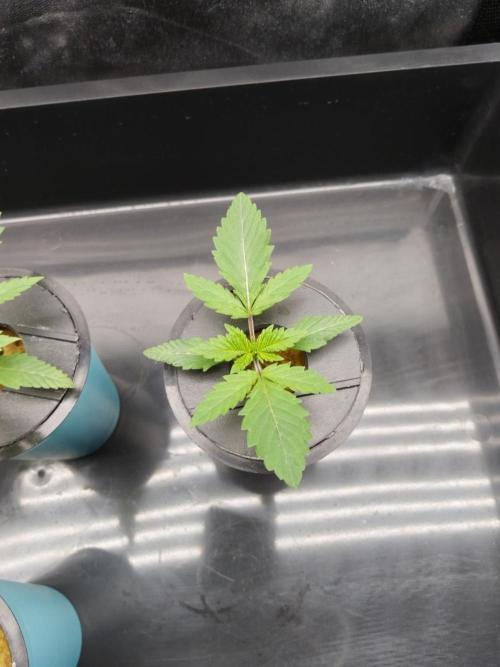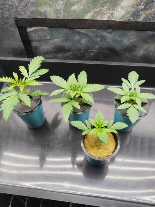 Day 5. Seeds start sprouting (3) from rockwool. Light distance 60cm - 150ppfd