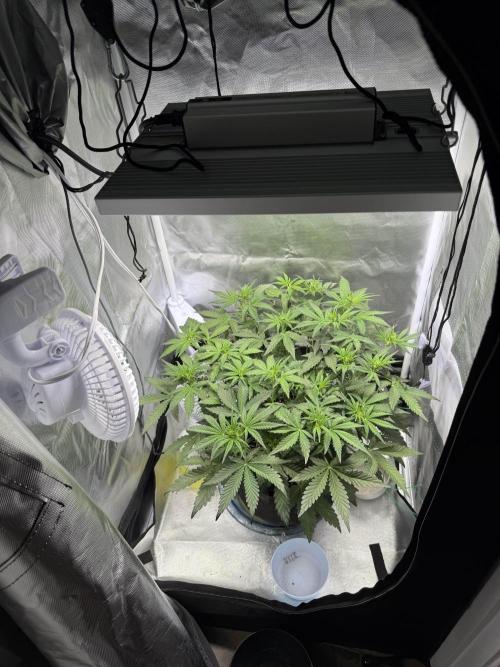 Plant has now been transplanted from the solo cup to its final home. 3gal fabric pot with buffered coco. At this point the plant is getting full strength nutrient solution about ~ 1000EC. Watering is twice daily using high frequency fertigation following the Coco For Cannabis guide, once at light on and once 10.5 hours after. My small humidifier in the tent is keeping the RH around 60%. Without the RH drops into the 30s. Still keeping bowls of water in the tent as well to keep the humidity up during this phase, particularly giving that the temps were in the higher range of what I think they were supposed to be. LED was increased to 60% per manufacture specifications.