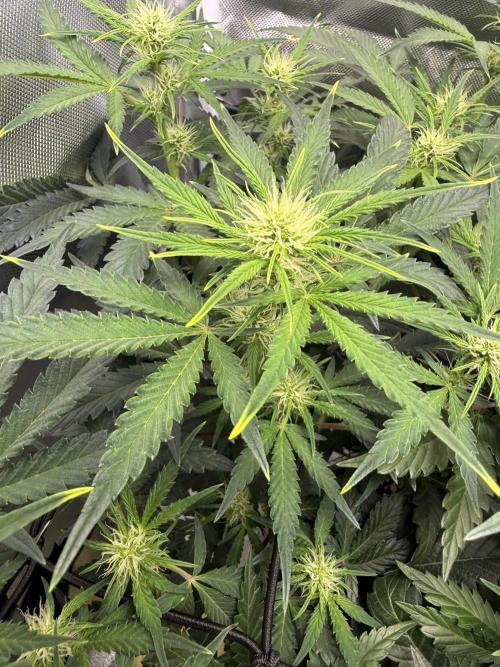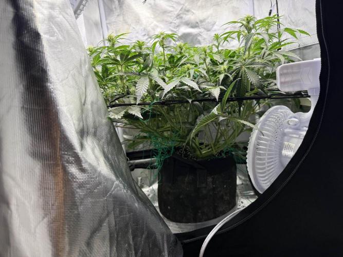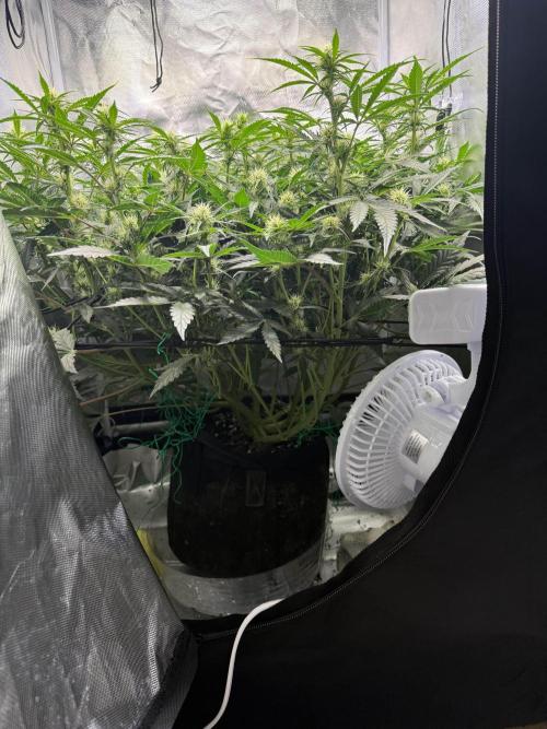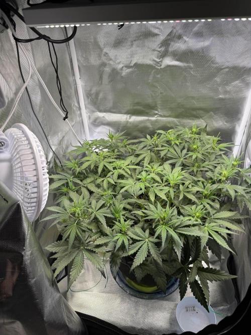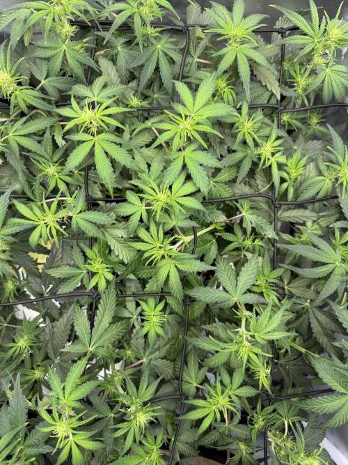 Firefly Week 5! End of Veg? Preflower? Flower? Very eventful week. Throughout this week at ever watering the plant got a round of LST+Tucking. At this point I'm trying to maximize the amount of growth sites getting light exposure and also trying to keep the canopy relatively flat/level. Full strength nutrients per normal. About this point I was getting really worried about space, particularly giving the genetics of this plant tend to the larger side. Impulse purchased a net and on 9/17/25 the ScrOG net was installed and I did my best to use it to curate the canopy. ~placed about 8" from the top of the pot and besides that I just gave it my best go, not exactly sure if I did it right or not. Towards the end of this week pistols become pretty apparent on most of the plant! Some very light defoliation was done, just a couple of oversized fan leaves that weren't getting much light anyway. LED was set to 100% (and slightly raised) per manufacture specification towards the end of this week.