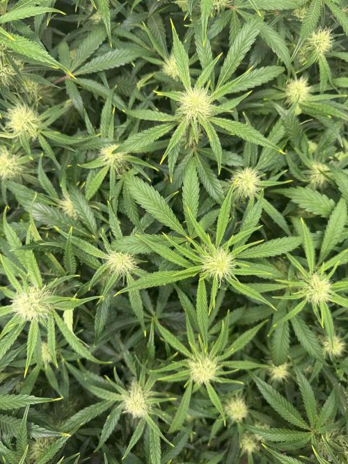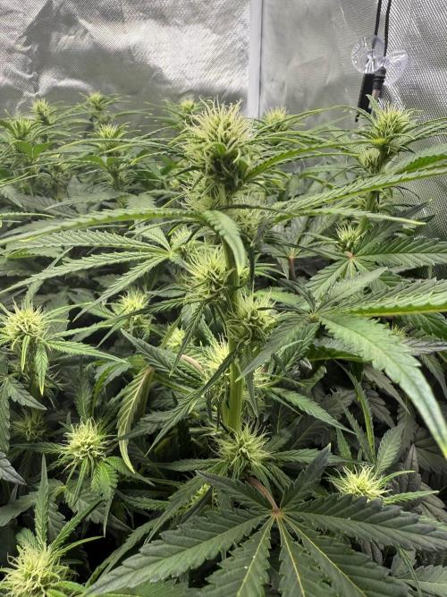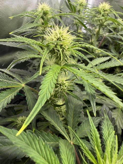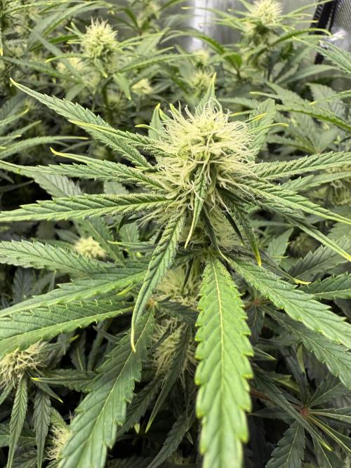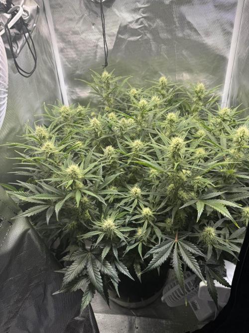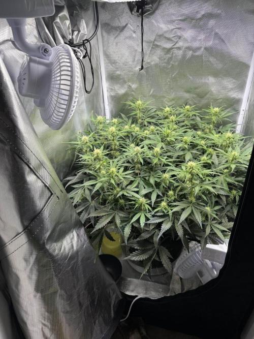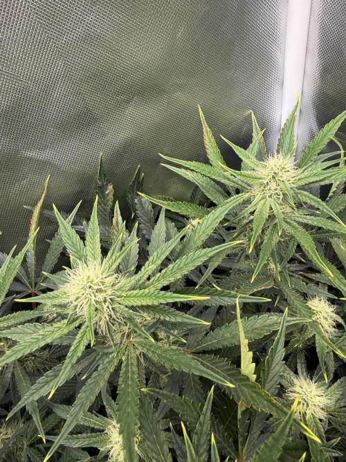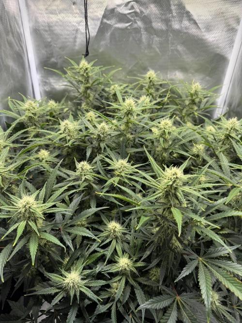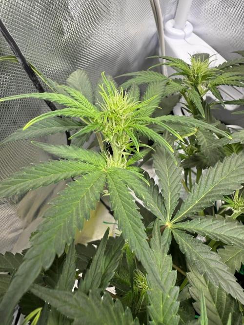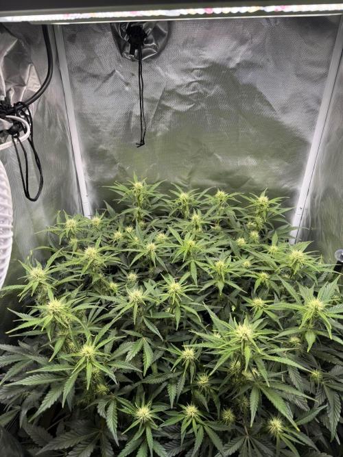 Firefly Week 7! Lots of growth and some unanswered questions. The biggest note of the week is the shear volume of plant. Fan leaves covered most of the air intake vent, very little light penetration through the canopy, and poor airflow underneath. Not sure if this was an optimal time or not to defoliate but I did a good bit regardless in the start of the week. Simply removing the leaves fully pressed up to the air-intake mesh had me removing a heaping handful. While scared to go too aggressive on the defoliation, I did want to at least make sure I had good airflow. Removed some large fan leaves below the scrog not getting light along with some in the canopy blocking colas. Despite removing what felt like 2-3x more than I should have given recommendations online, I still don't feel like I can visually tell much a difference in photos. If I noticed particularly good leaves to remove I did so, but besides that I tried to give the plant some time to recover after my initial burst of defoliation. I'm noticing plenty of growth sites that will produce sub-optimal bud, not sure if I'm willing to do anything about that right now, just want to make sure the plant makes it to harvest lol.