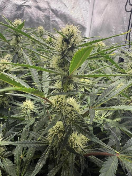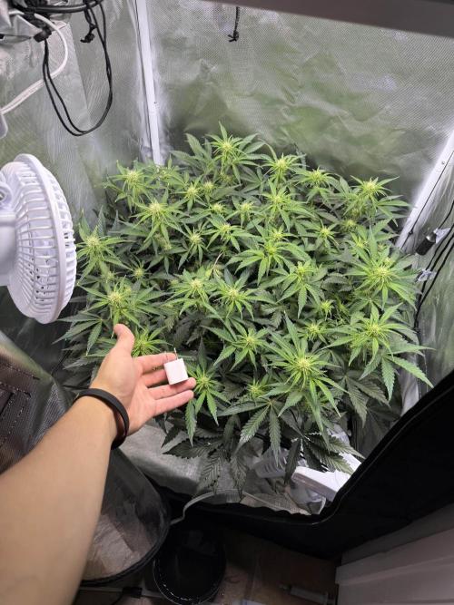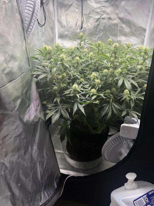 Firefly Week 6! Yep its flowering. For sure. Each week it surprises me with how fast it grows. Swapped to the "bloom" nutrient mix, at a slightly lower than full dosage (read somewhere that it made sense to do that, though it was getting full strength 7.5ml/gal of the Bloom by the end of this week). At this point the plant is wall to wall covering the tent and almost regretting going so aggressive on the LST/Tucking. RH% in the tent are now getting much higher than just last week, multiple nights where it peaks at 99%. Removing the humidifier was an easy fix to this (duh), though the RH stayed on the higher range of where I think it should be, but the temps also were a tad higher so at this stage I was unworried (still in the acceptable zone of the generic RH-Temp charts). Exhaust fan was bumped up from about 30% to 80% to also try and help, any higher and the box would pull enough negative pressure to really squeeze the walls in.
