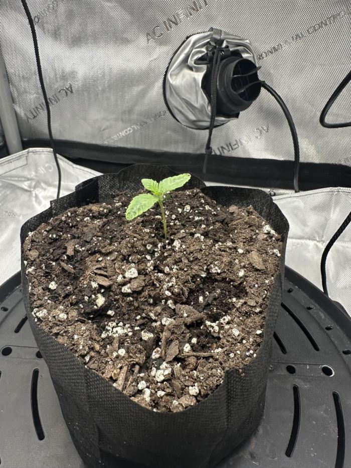 TugMasterson New grow, here we go! Excited to grow another of my favorite "legacy" strains. It is off to a great start, I've never seen (albeit my experience is limited) a seed show green that quickly, it was over night! Did my typical germination routine of letting the seed sit in a glass of water over night and then into a moist paper towel in a plastic bag. Once there is a bit of root (as seen in photo) it is time to plant. Used the fabric nursery bag again so transfer will be easy. Will probably have to use the heater since outside temperatures are really dipping. This is my first time using a non-Royal Queen seed, will be interesting to see how it goes.