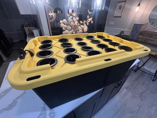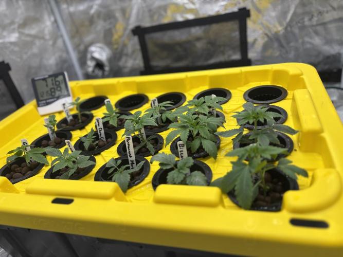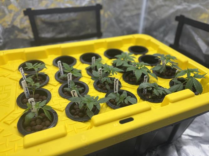 Crop_Top Got 14 of the plants transferred over to the veg tent with the DWC container. Using 3in net pots with clay pebbles and a rockwool cube. Going with Advanced Nutrients throughout the grow.
