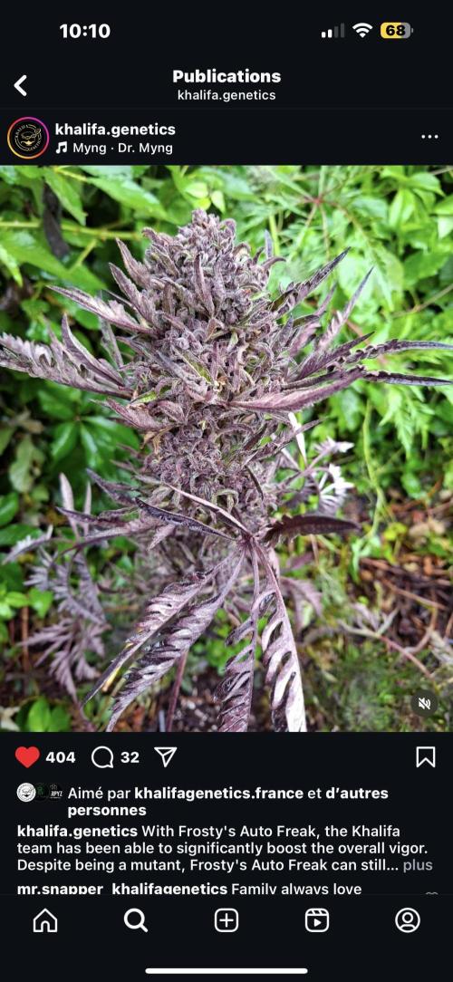 BrigadeDesTerps Aspect des plantes Cette plante n'attend que de se montrer. Dès les premières feuilles, Frosty Auto Freak prend des allures de dessin animé : des brins de fougère, des angles étranges et, finalement, une structure touffue qui se couvre de fleurs denses et couvertes de trichomes. Les tons violets se font plus intenses à mesure que la plante mûrit, se répandant sur les feuilles résineuses et les têtes comme par magie. Bien qu'autoflorissante, elle pousse haut et fort, souvent plus imposante que ce à quoi on pourrait s'attendre d'une autofloraison. Une vraie mutante, mais dans le bon sens du terme. Goût et odeur Lors de la floraison, l'atmosphère se remplit d'un parfum de baies sucré et puissant, mêlé à une base Kush épaisse et terreuse. Certains phénotypes sont plus fruités, tandis que d'autres sont plus puissants. Quoi qu'il en soit, le nez est clair : celui-ci est puissant. Une fois fumée, la saveur persiste. On ressent des baies juteuses à l'inhalation, puis un arrière-goût profond, épicé et kush qui persiste longtemps après la fumée. Riche et sucrée, elle est difficile à lâcher une fois commencée. Effets Frosty Auto Freak démarre par une légère élévation mentale, vous plongeant rapidement dans un état d'esprit agréable. Puis, lorsque l'effet s'installe, il se transforme en une vague corporelle qui dissipe les tensions et apaise le bruit. C'est le genre de variété qui monte lentement en puissance et vous maintient dans un état d'euphorie intense pendant des heures. Parfaite pour une consommation nocturne ou pour se détendre après une longue journée, cette autofloraison ne se contente pas d'une apparence sauvage : elle procure un effet doux, puissant et profondément relaxant. Caractéristiques de culture/Rendement Ces graines de cannabis mûrissent en 9 à 10 semaines environ, de la graine à la récolte, ce qui en fait une excellente option pour les cultures rapides et discrètes. Les cultivateurs en intérieur peuvent espérer jusqu'à 400-500 grammes par mètre carré, tandis que les plantes d'extérieur peuvent produire environ 100-150 grammes chacune, selon l'espace et l'ensoleillement. Frosty Auto Freak supporte bien le palissage et ne s'étire pas trop après la floraison. Ces graines de cannabis à autofloraison sont parfaites pour ceux qui recherchent des niveaux élevés de terpènes, une apparence sauvage et une croissance facile du début à la fin.