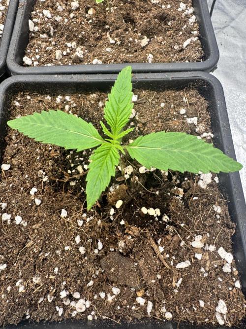 Cotyledons are fully open and the first serrated leaves are developing nicely. The color is a vibrant green, showing good vigor and healthy root growth.
