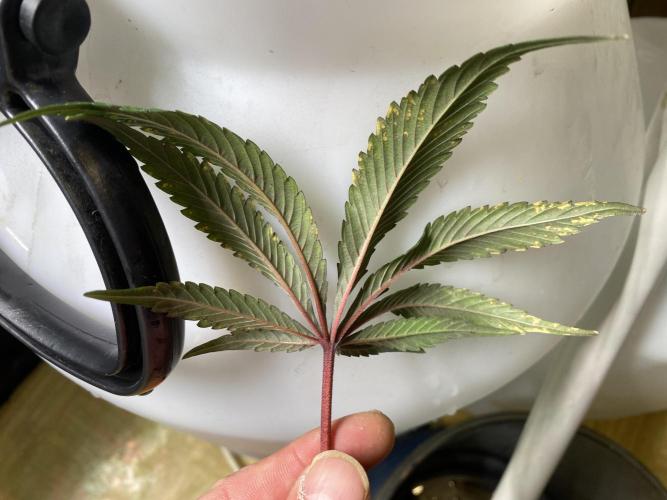 Trichomes at the end of the 7th week 60% clear 40% milky A few plants have a problem with red leaf petioles What is the shortage?