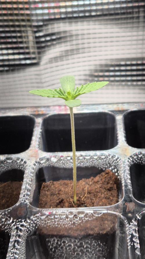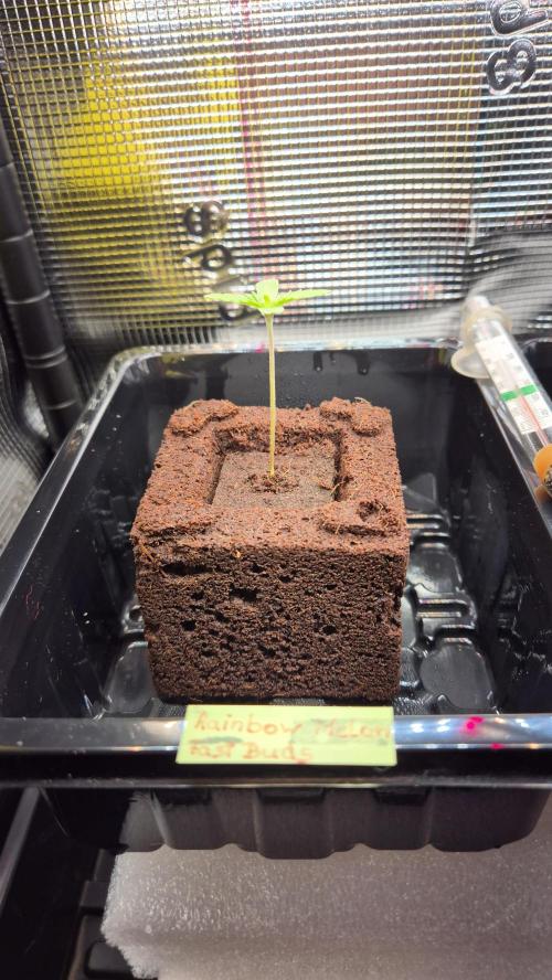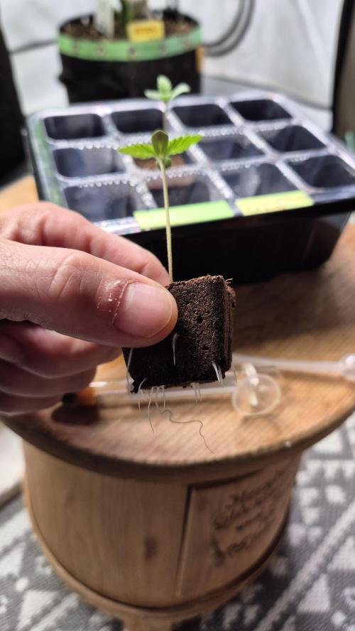 * Tag 0.6: Alles unter Kontrolle. Die Pflanze zeigt vitales Wachstum. Die ersten "echten" Blätter entfalten sich. Und die ersten wurzeln haben den Easy Plug bereits durchwurzelt. Der nächst größere muss her. Das DLI wird auf 20 erhöht.
