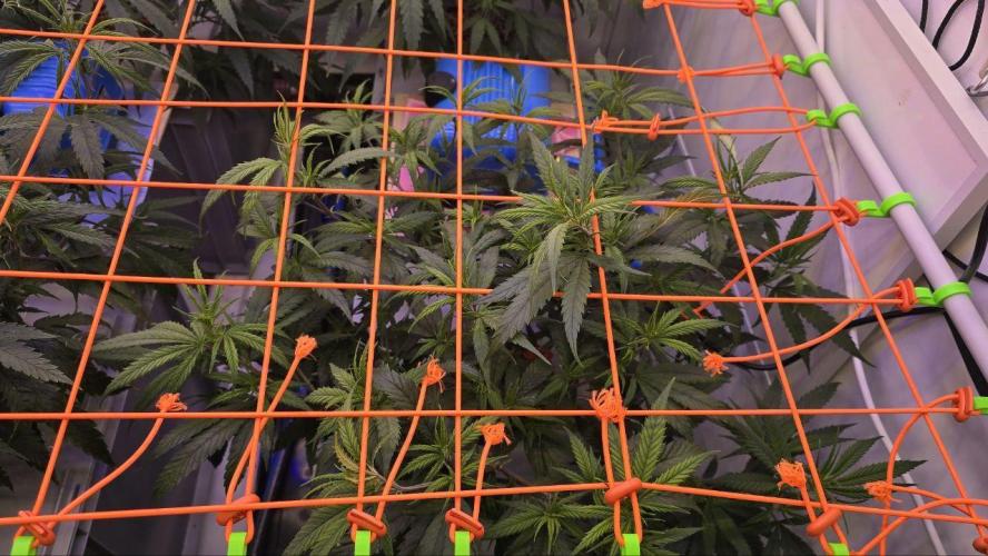 Keep weaving the shoots into the Scrog grid until 70–80% coverage.
