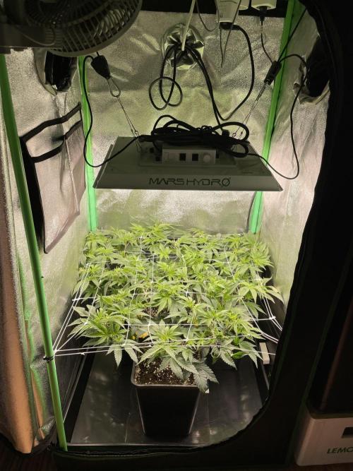 Whodeletti Die Pflanzen hab ich weiter mit LST und Drähten nach unten gebunden um die Pflanzen möglichst breit zu bekommen, bis sie das Netz erreichen.