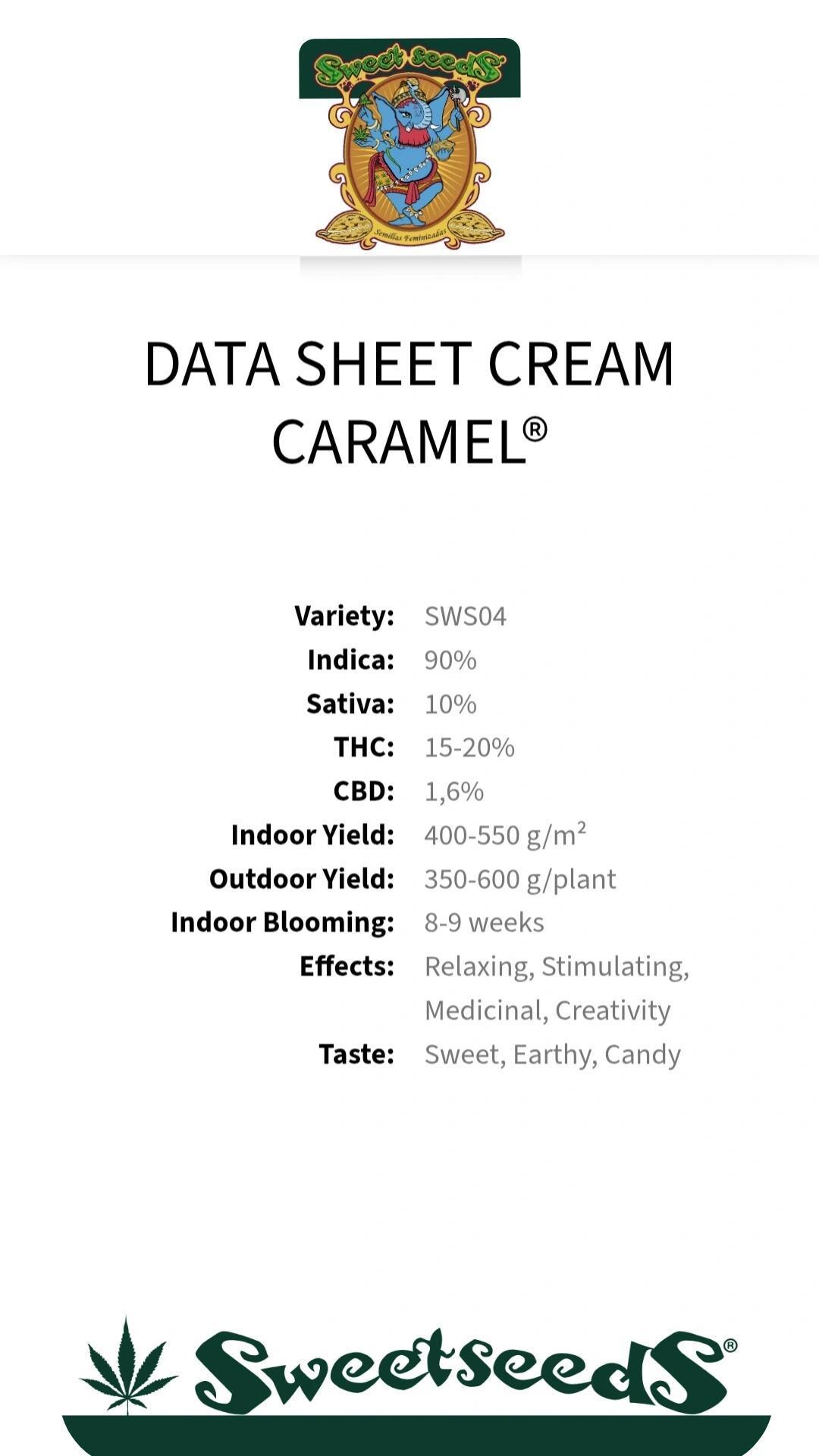This indica dominant plant consists of 90% indica and 10% sativa. Cream Caramel is the result of mix of the best indica genetics such as BlueBlack, Maple Leaf Indica and White Rhino. It has numerous awards. The strain is popular with medical users.It's ideal choice for indoor cultivations, but also suitable for outdoors. The plant produces 400-550 g/m2 indoors and 350-600 g/plant outdoors. The plant developes a dark green leaf, densy buds and a big amount of white crystals with a high THC content of 15%-20%Cream Caramel provides a sweet deep taste, like caramel, with earthy notes that are inherited from BlueBlack. The strain is a great relaxant and antidepressant.
