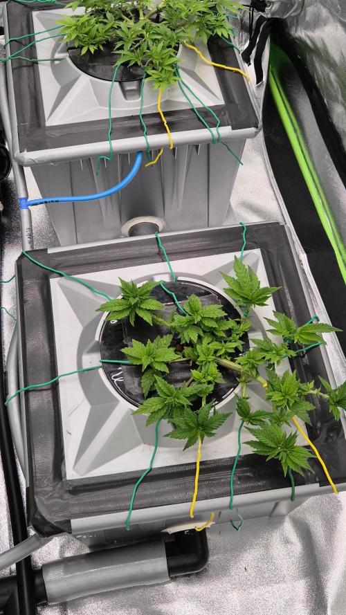 Plants range in height from 5-7” except #1 which has been pinned to the soil. I will try wrapping her around the perimeter of the pot. Since she leaned over, I pinned her down and have been anchoring along the rim, twisting the stem so the node is on the side or top rather than underneath. I don’t think she likes training since the stems are a bit floppy. They are all still in veg, bushy with large indica leaves. I’ve been tucking the large leaves under the bud sites to give more light under the canopy. I’m tempted to top one of the bigger plants to have a comparison on resistance and final yield.