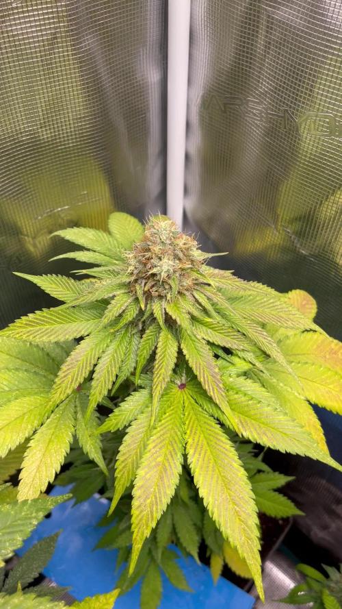(ON Haze X Original Haze) X Northern Lights #2 “Todd’s Haze” Objective - 8 Female Plants, Topped ONCE @ Flip, 12” when topped - Modified Sea of Green Seeds Wet: 1139PM, 28.2.2025 Germinated: 2.3.2025 Flip: 21.3.2025 Harvest: 77 Days, DATE: 6.6.2025 _________________________________________ Initiate Auto-Fertigation LightDistance: [ 19.5, in] # We’re in STRETCH, ~1.5”/day! 11” Top Canopy - [ ] TM-7: [ 0.125, g] # Prep - [ ] Fertigation: [12, 12, 6] # [Primer A, Primer B, Silica Skin], Dilute to EC - [ ] Photosynthesis Plus: [ 6, ml] __ Fri Apr 18, 2025 TH 1Q25 29:F:4:1 __ Sat Apr 19, 2025 TH 1Q25 30:F:4:2 2000 Watering w/ PCAL 1660 Fertigation: [ 1, gal] RLA: [ 8.5, 4.2, 3.4] PCAL 1660: [ 2.5, ml] # Micronized Powder __ Sun Apr 20, 2025 TH 1Q25 31:F:4:3 Light Distance[TOP]: [ 11, in] # Still Stretching LightIntensity[TOP]: [ 925, µ], [ 40, mol/day] LightIntensity[Main]: [ 801, µ], [ 34.6, mol/day] We’ll Raise EC by 0.1 mS/cm/day till we’re comfortably ~ 2.4 (IFF They’re happy) … Would like to see overall GREEN both darkening & evening out . . . Defoliation - [x] Remove Fan Leaves below Node 7 # Preparation for Understory Lighting - [x] Remove Branches with TOPS bottom 25% of canopy Auto-Fertigation Today - [x] CLEAN Chiller - [x] Vinegar - [x] H202 - [x] High Throughput (Blast the interior AFTER Vinegar & H202) Initial Reservoir Fill: EC: [ 2.0, mS/cm] - [x] 4 Gallons (Dehu, RO, or Distilled) - [x] Primer A & B: [ 54, ml] - [x] Silica Skin GEN 3: [ 27, ml] - [x] Photosynthesis Plus: [ 24, ml] While configuring - Ran 2 Gallons of Feed Before UNPLUGGING. ;-} __ Mon Apr 21, 2025 TH 1Q25 32:F:4:4 - [x] Light Distance[TOP]: [ 9, in] # Still Stretching 1.5 - 2”/Day Reservoir Fill: EC: [ 2.1, mS/cm] - [x] 4 Gallons (Dehu, RO, or Distilled) - [x] Primer A & B: [ 54, ml] - [x] Silica Skin GEN 3: [ 27, ml] - [x] Photosynthesis Plus: [ 24, ml] - [x] SLF-100: [ 20, ml] We’ll take EC to 2.4 mS/cm (Relatively Heavy) IFF They’re all happy with the ‘upgrade’. ;-} Picked up 8 gallons of Distilled from HEB. Used for to refresh tank after last nights flush. Going for NO MORE than 2 Gal/Day. We’ll feed MORE than necessary to get DOWN TO Optimal delivery. Irrigation Timer is set to Every 3 Hours, 1 min flow, four times a light period. __ Tue Apr 22, 2025 TH 1Q25 33:F:4:5 Observation Vibrant, Uplifted, Rockin’ - 1250 runoff, Grew TWO MORE INCHES, Light Distance 6” 1900: Measure Runoff - Amount: [ 1250 , ml] - EC: [ 2.1, mS/cm] - [x] Harvest Dehu - [x] Refresh Reservoir - 2 Gallons - [x] EC: 2.1 - [x] Primer A & B: [ 27, ml] - [x] Silica Skin GEN 3: [ 14, ml] - [x] Photosynthesis Plus: [ 12, ml] - [x] SLF-100: [ 10, ml] __ Wed Apr 23, 2025 TH 1Q25 34:F:4:6  Plants Look GREAT!