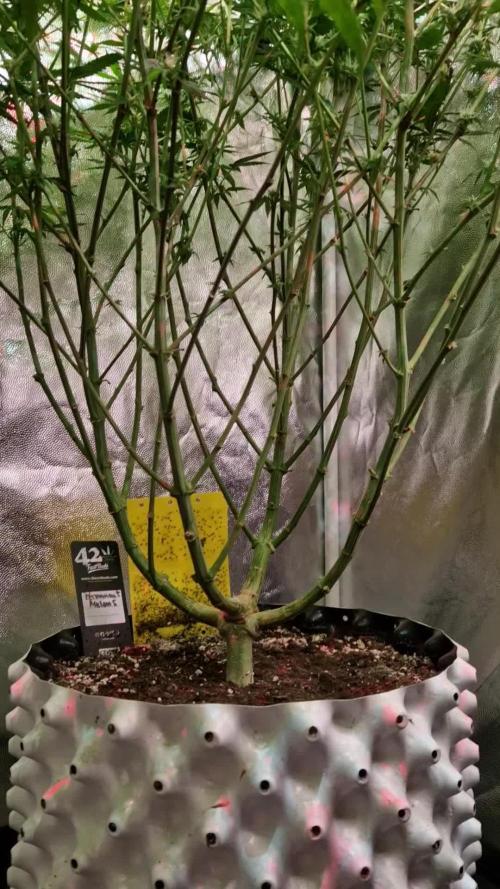 General —— Plant is doing fine. Had no issues this week and the devlopment looks solid. Hope she will stretch a bit more in the next week so that the fems can use the trellis once they are far enough. Nutes —— Gave her Bio PK 5-8 for one time which was a harsh feeding as I mixed it with all the other nutrients. Other than that I'm watering 1.5L of Water every 3 days with CalMag and Horsetail Extract. A bit of nutrient burn on the lower leaves but nothing to worry about Light —— Bumped light from 120W and 30cm distance to 210W and 40cm distance by end of this week. DLI is around 40 at the moment. Defoliation —— Removed some leaves in the middle so that everything gets light. Also removed some leaves from the bottom which were shaded. Will remove branches that don’t make it end of Week 6