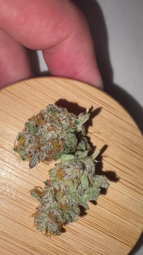 Beginning of week.. So I went ahead and did a late defoliation.. humidity is sitting too high in the tent.. its been around 50 - 55 % RH but it does sometimes get up to 60% RH.. removing some of these leaves should help lower the RH AND lower the chances of getting mold.. these are gonna be some fat colas.. and those are the ones mold can creep up on.. doing my best.. dehumidifier just cant keep up.. but I also dont run it inside the tent due to the heat that thing and it's transformer give off when it runs for over 24 hours or so.. but she shouldn't mold.. I've got 3 fans inside just moving air.. but of course, sometimes that isn't enough.. but we will see how this goes.. may even add another fan.. keep it on the floor of the tent an point it up.. we shall see! But damn she smells so amazing.. i can smell alot of similarities from the Mandarin Cookies in here.. which also has Mandarin Sunset as a mother.. just as this one does.. but you can smell the skunk along with it.. but not as powerful as the citrus.. aw man the citrus.. love that shit.. I even chewed on a trichome covered fan leaf.. very delicious! So glad I have 9 more of this strain and a few others from ETHOS.. next run may be some Aura Genetix.. I've gotta see what fast versions are all about.. I bougt some of the Peach Bellini.. should be pretty epic.. keep an eye out for that diary after this one! Mid week.. Lower branches are getting plenty of light after the defoliation. The smell is getting intense. My carbon filter has began to smell like shit lol. Not literally.. but it stinks.. maybe like rotten skunk or something.. I've ordered a new one but I took that smelly one off for now.. so the whole block smells like member berries right now till the new filter comes in.. tomorrow. I couldn't figure out what the smell was untill i accidentally got my face into the exhaust fan wind.. smelled like rotten skunky shit.. lol. I guess I forgot things need to be changed out every so often.. just figured "air" running thru it wouldn't make it crap out so fast. Been maybe 8 - 12 months.. something like that. Never used one before this.. but running some ETHOS, it is a must! So citrusy! Purples are slowly coming in. She really reminds me of the Mandarin Cookies I grew.. but I also think the Mandarin Cookies was heavier on the Mandarin Sunset phenotype side.. and this one is pretty similar. Scent, growth, stretch.. but I know I cant say for sure that's what it is.. this is just what I believe is going on. But wow.. such a beautiful plant.. I've had to run a a few twist ties to other branches in order to keep them from flopping over, leaning on eachother and the sides of the tent.. should have scrogged I guess lol.. live and learn tho.. but so far its not too bad.. but this early on shows me what I might have to be dealing with in the next couple of weeks cuz they are beginning to get STACKED! I've said it before, and I'll say it again... ETHOS for the win 🏆 Later that day... Wow.. going back in again and now she smells just like the Early Lemon Berry! Wth! How is that even possible?! She is doing amazing things! Some calyxes are beginning to turn purple. Some of the top leaves are as well. Tried to get some decent pics of it.. but I guess I cant figure the new phone out.. as you can see, some pics are a little blurry. And sometims the capture is delayed behind the flash and I still get a dark pic as if it didnt even flash.. but whatever.. I can't wait to see what she has to offer! Such a gorgeous girlie! So happy and excited for this one! End of week.. Nothing left to do now but feed/water for about 1 more week and she will be ready for the 2 week flush!.. I normally like to just water as normal (without nutes, duh) for the entire 2 weeks and still keep checking runoff.. maybe FloraKleen once a week and then just water till harvest! So far, I am starting to see some milky! Still mostly clear, but that means she is getting closer! So excited! This girl really smells just like the Early Lemon Berry I grew! But still with a bit of sweetness to it too! Aw man I can't wait! Anyways... on to the next week!...